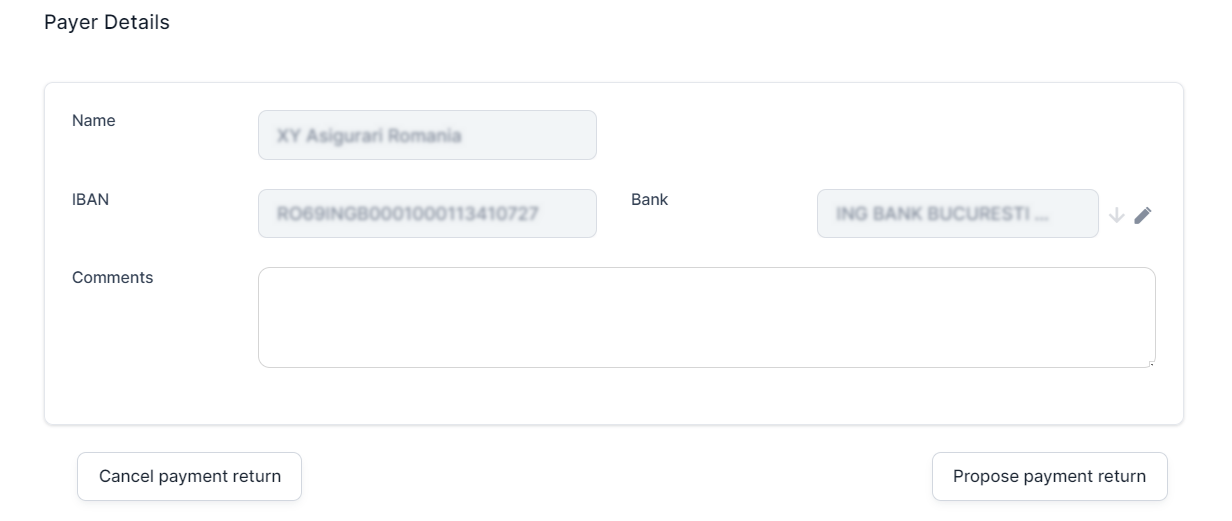 The Payer Details section, to input the company's details. Insert any relevant information in the Comments field, to be considered when approving the payment request.