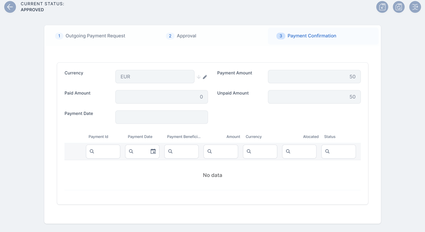 Click Approve. The record is now in Approved status, and in tab 3. Payment Confirmation, you can see the details.