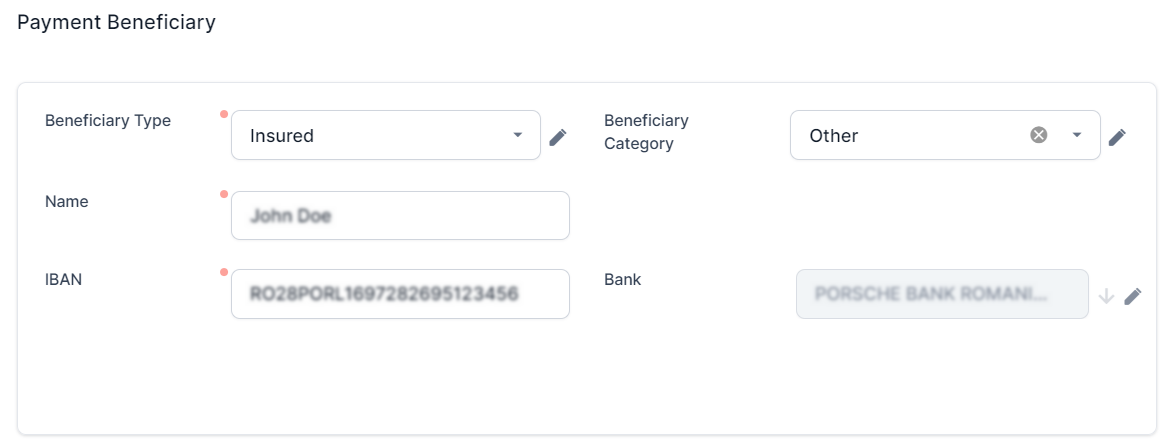 The Payment Beneficiary section, where the Beneficiary Type can be: Payer, Insured, Contractor, Policy Beneficiary, Broker, Service Provider, or Other.