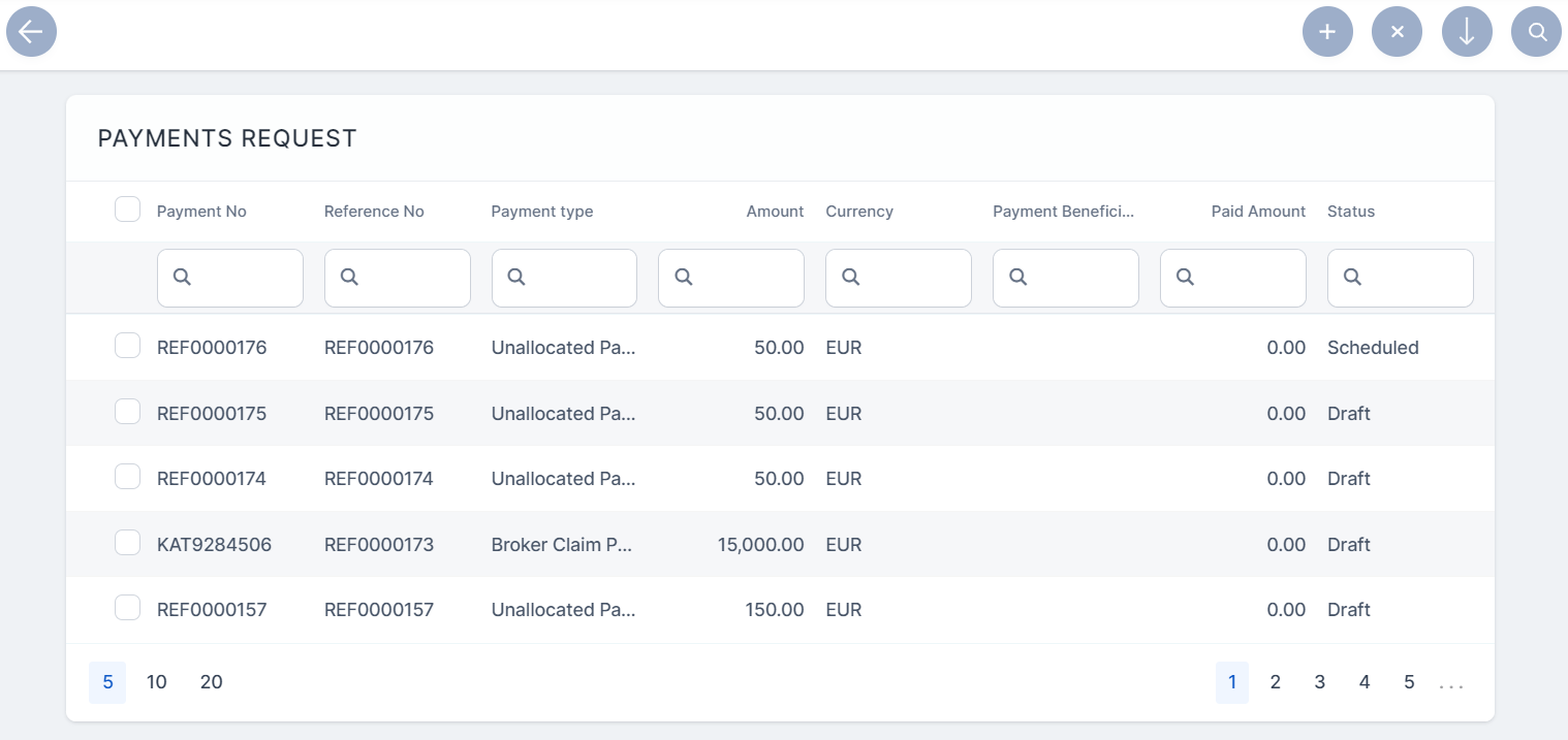 Payment requests are automatically registered into your system when you use the Bank Statements functionality to upload your bank statement files. Your import triggers the automatic parsing, sorting and matching of the Payment data - contained by the file, with the Outgoing Payments already configured or scheduled by you - such as broker commissions. For payment requests that respect some rules, such as providing the correct unique identifier for a broker or the number of the policy under brokerage, the allocation flow for the outgoing payment is completely automated. After import, you can find all the new outgoing payments into the Outgoing Payment Requests section. You can recognize the automatically allocated outgoing payments by their Paid business status. If necessary, you can open a record to see the paid amount. More details about how the system does the sorting of the received payment data, in the Import Bank Statements documentation.