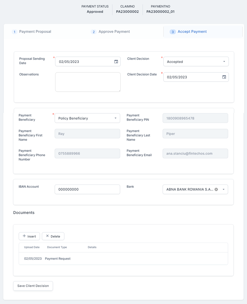 In the Accept Payment tab, input the Proposal Sending Date, the Client Decision, which can be Accepted or Unaccepted, the Payment Beneficiary from the drop-down (all the payment beneficiary data is automatically taken from the policy), the IBAN Account and Bank.