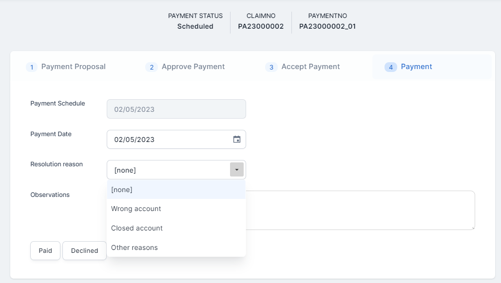 If you choose to decline the payment, you need to choose a Resolution reason from the drop-down, then click Declined. The payment status moves to Declined.
