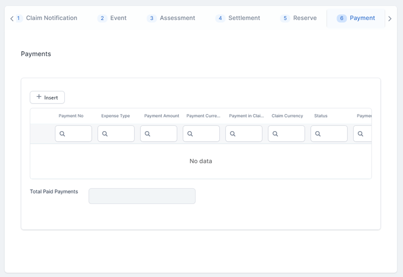 - Choose the Expense Type from the drop-down, choose the Payment Currency and input the Payment Amount. If you input a value less than the loss value, then the Payment Type is Partial. If you input the whole loss value amount, then the Payment Type is full.