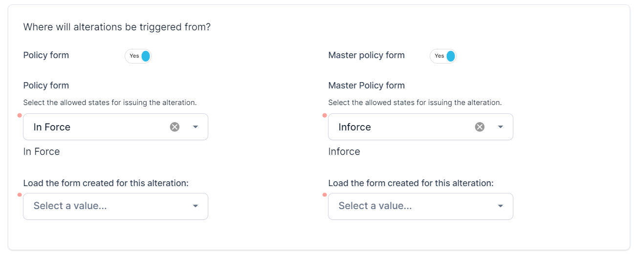 In the next section, Where will alterations be triggered from?, define if you want the alterations to be triggered from the policy form or from the master policy form. In both cases, if the fields are checked, a new section is displayed where you can select in which policy or master policy status the alteration can be issued. Also, select an alteration form driven flow to apply in this case. You can choose an existing flow, or create a new one, and select it.