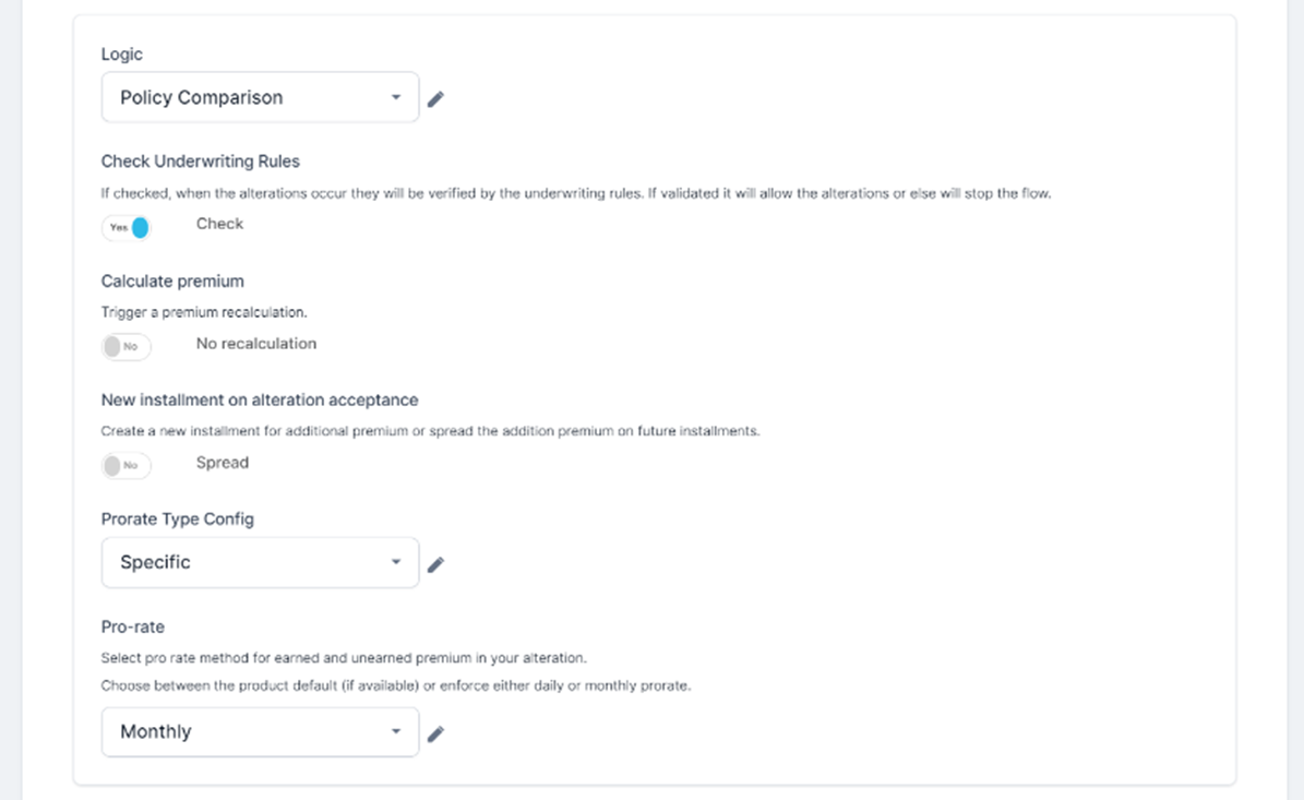Pro-rate: Select the pro rate method for an earned and an unearned premium in your alteration. Choose between the product default, if available, or enforce either daily or monthly prorate.