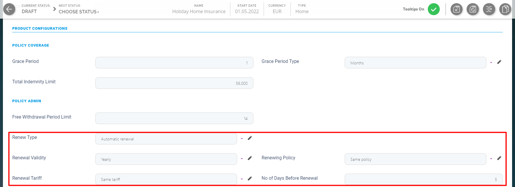 In order to configure whether the contracts under a specific Insurance Product should be automatically renewed or not, you must set the Renew Type on the Insurance Product level.