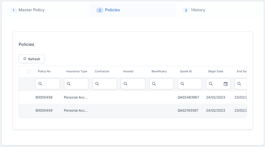 A specific grid with all the policies included in that Masterpolicy is displayed below the mentioned fields. Double click a record to be redirected to that policy form.