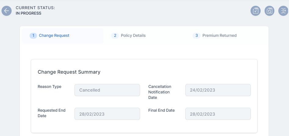 Cancel the first policy. In this case, the Requested End Date is set as the 28th of February 2023.