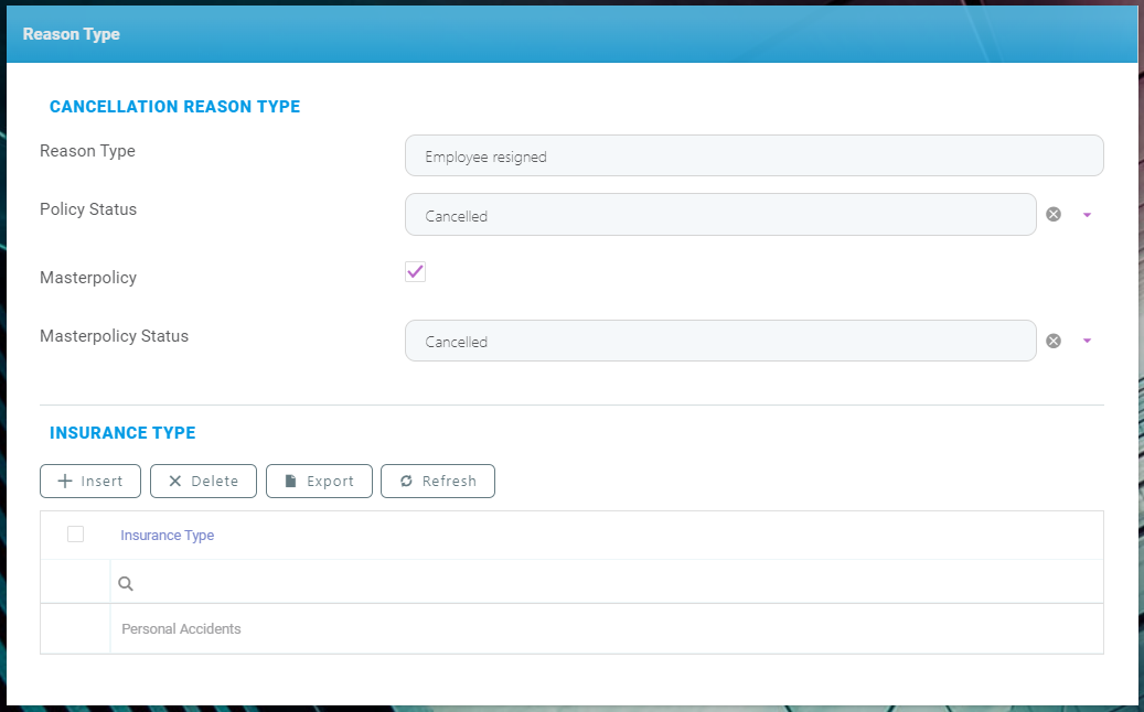 Policy Administration offers you the ability to configure if a specific cancellation reason type should be included as a reason type for a Masterpolicy beside the policy.