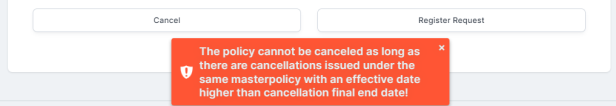 You can cancel multiple different policies that are part of a Masterpolicy. However, you cannot cancel one of the policies, is its Requested End Date is less than the Requested End Date of another policy that is in its own cancellation process.