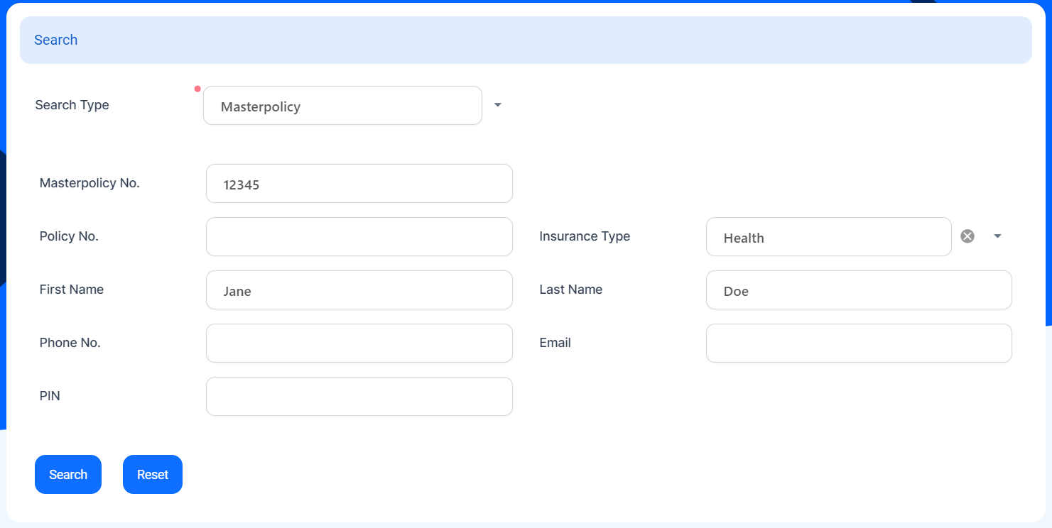 Click the Insert button. The Masterpolicy Search form is displayed. Select the Masterpolicy option from the drop down.