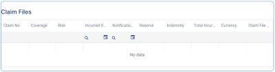 Claim Files: This section displays a list with all the claim files recorded to that policy. The claim file data is updated after each API call for said claim file with the latest data. The values are updated each time the API is received.