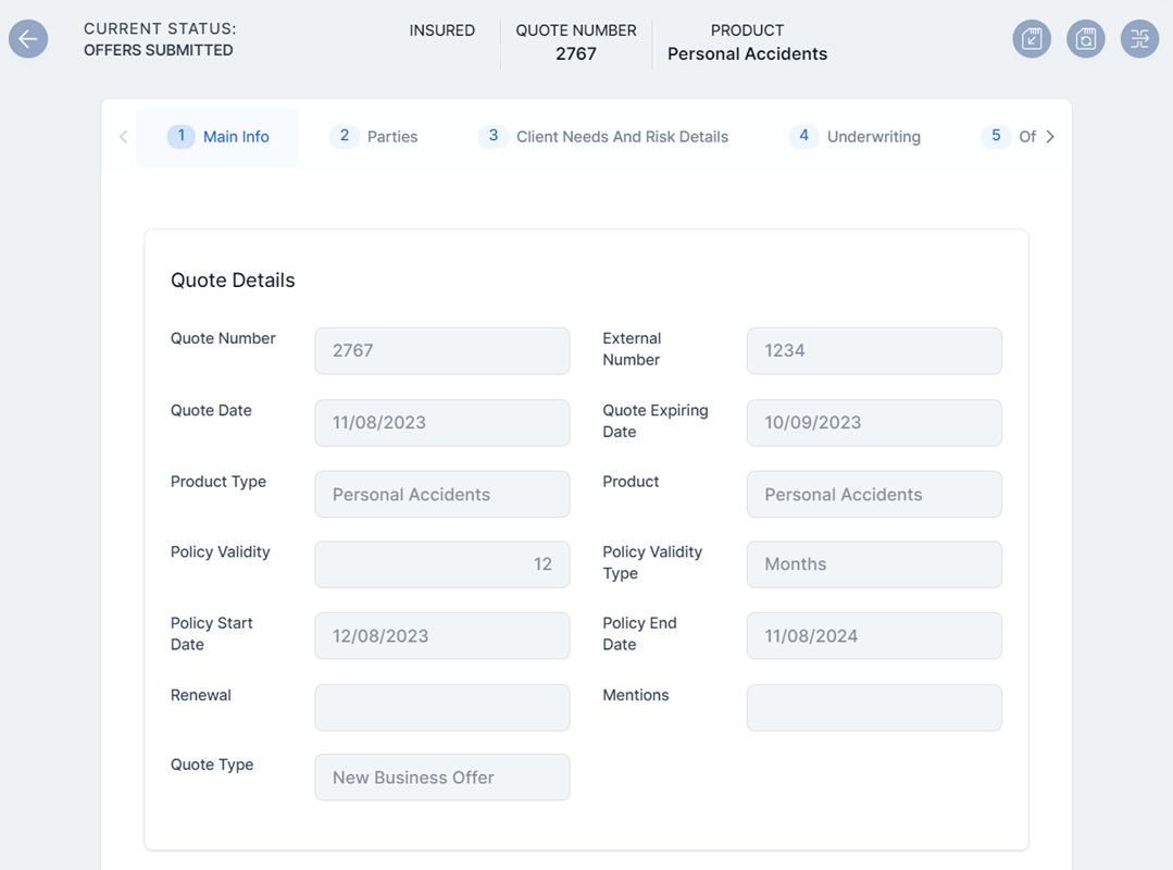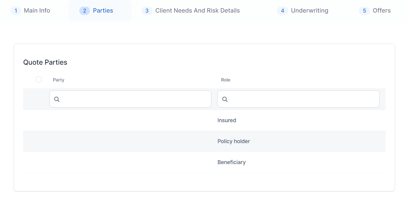 Click the second tab, Parties to display the list of all parties involved in the quoted policy.