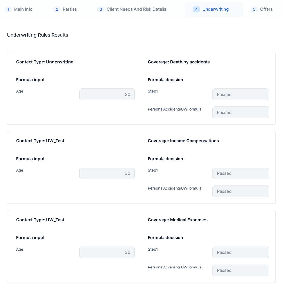 Click the fourth tab, Underwriting. This section presents the underwriting rules results for each chosen coverage, based on their formulas.