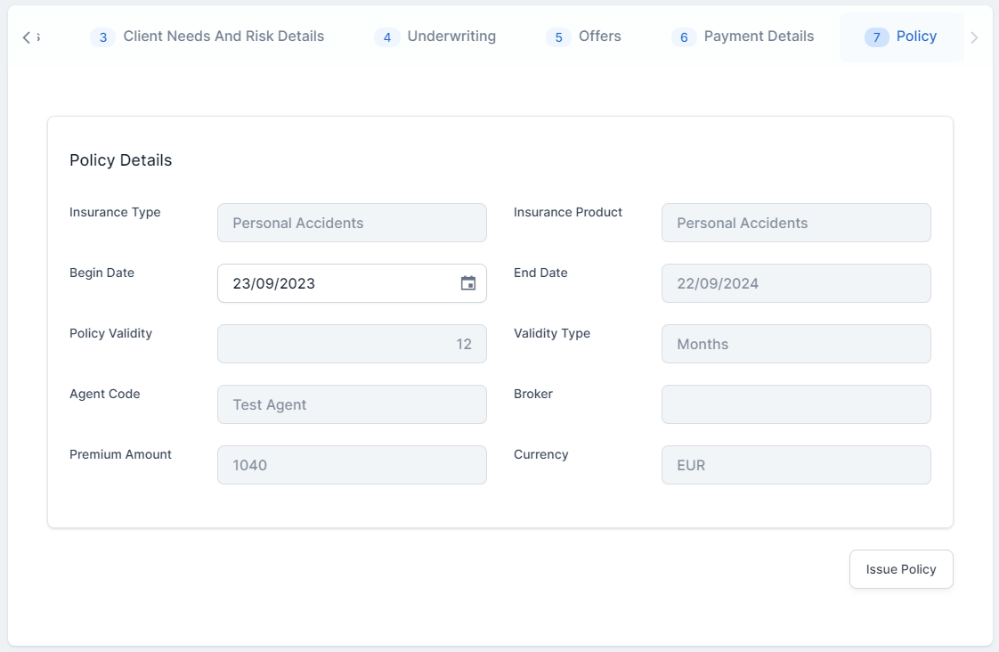 Go to tab 7, Policy. Inspect the basic details of the policy to be generated, choose a Begin Date for the it, and click Issue Policy. The quote transitions to the Policy Issued status.