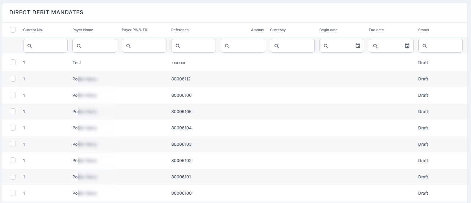 In FintechOS Portal, go to Main Menu > Billing & Collection > DIDE UK > Direct Debit Mandates. The list of all direct debit mandate records is displayed.