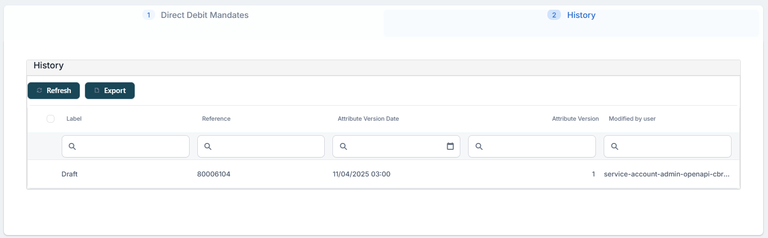Click Save and Reload. The record is now inserted, and you can find it in the Direct Debit Mandates list. In the form, the History tab becomes available, where you can see updates of the record's version.