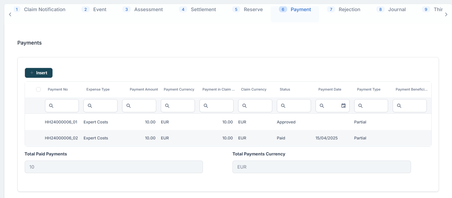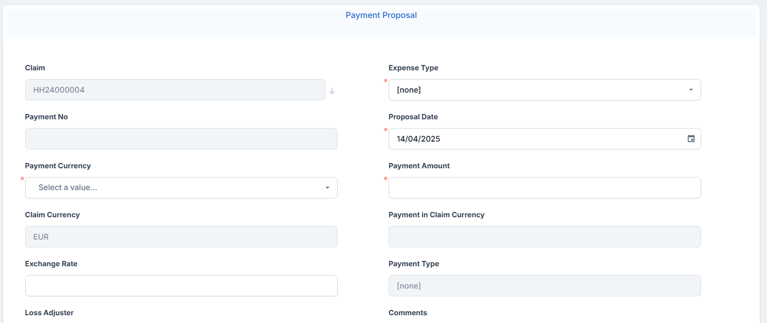 - Choose the Expense Type from the drop-down, choose the Payment Currency and input the Payment Amount. If you input a value less than the loss value, then the Payment Type is Partial. If you input the whole loss value amount, then the Payment Type is full.