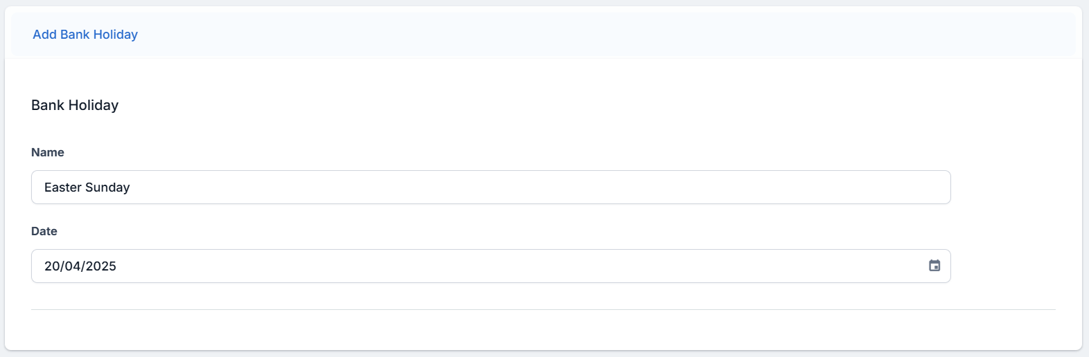 Inside the Settings menu, click Bank Holidays. The Bank Holidays List page is displayed.