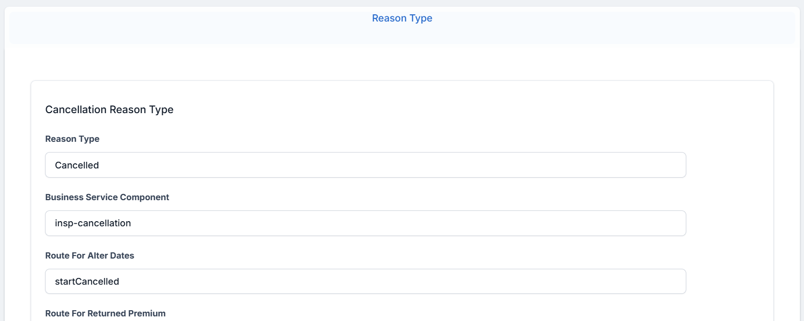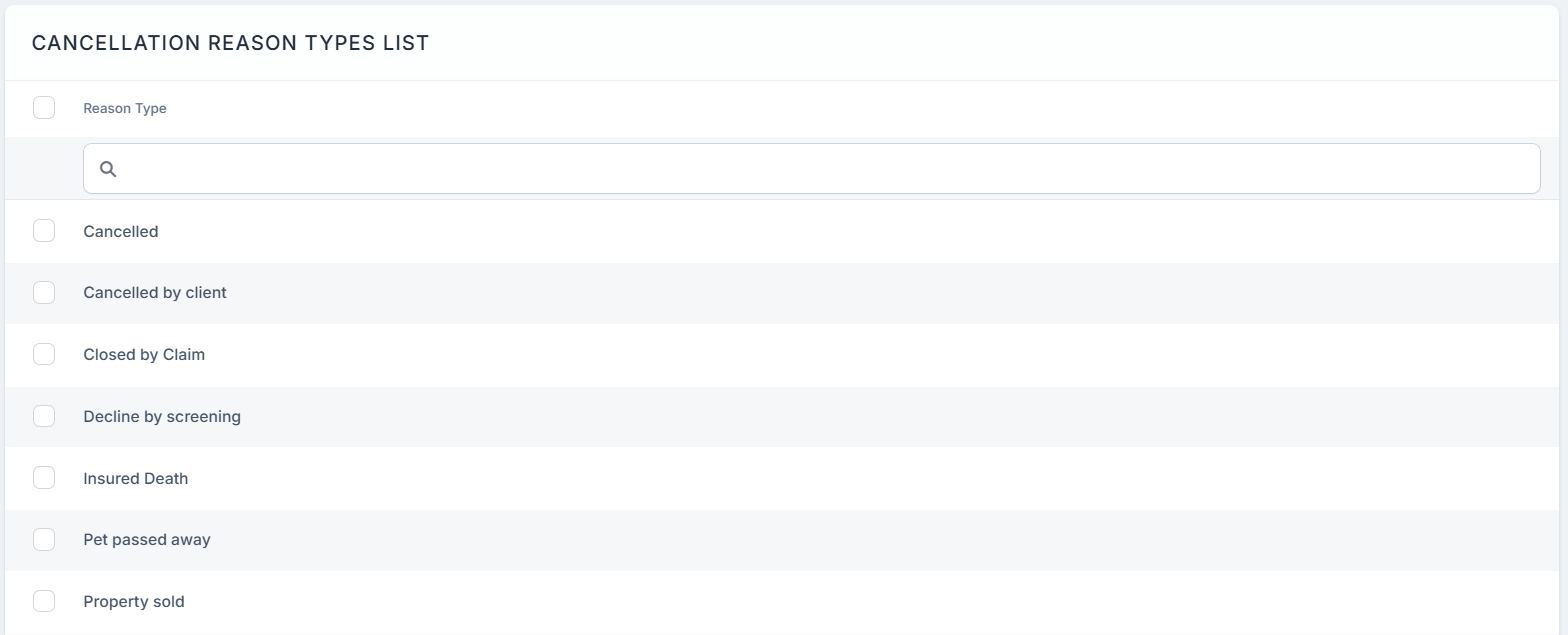 Policy Administration allows you to configure the reasons why a policy can be canceled and also, if a specific cancellation reason type should be included as a reason type for a Masterpolicy beside the policy.