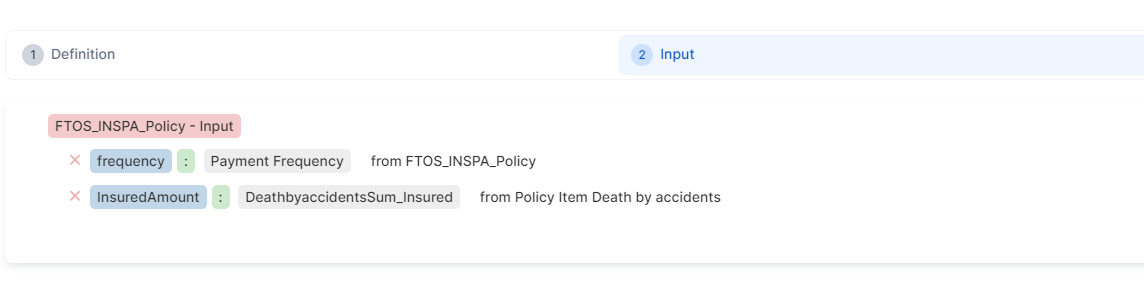 Policy Administration consumes insurance formulas included in the product definition. When using a formula associated to an insurance product within a policy, you must specify the formula mapping, that is the input data to be used for the formula in the context of Policy Administration.