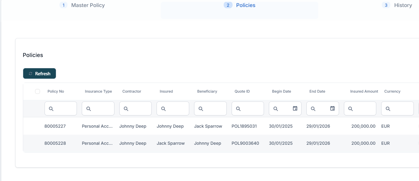A specific grid with all the policies included in that Masterpolicy is displayed below the mentioned fields. Double click a record to be redirected to that policy form.