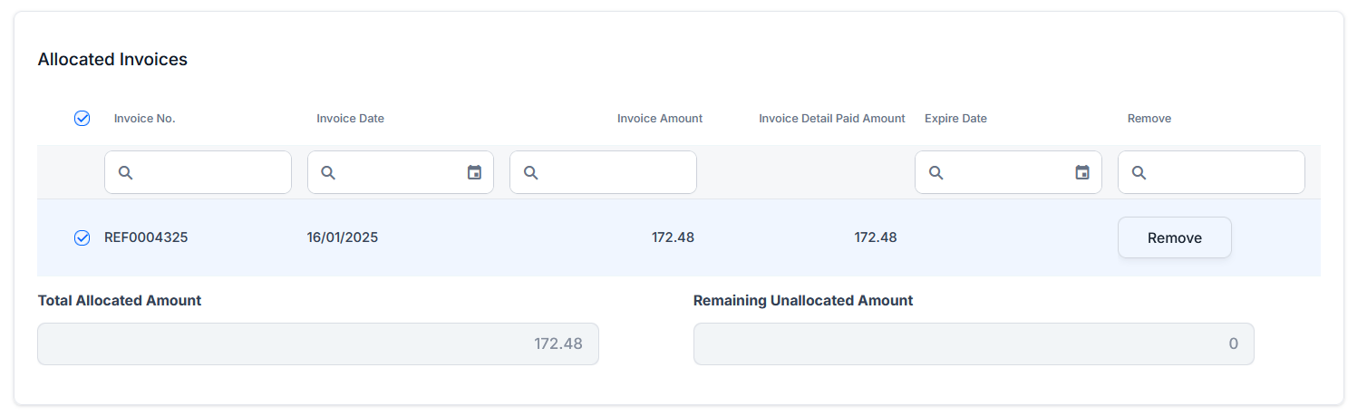 Click Add on the invoice record. The Allocated Invoices grid is displayed with the number of the invoice, the invoice amount, and the detailed paid amount.