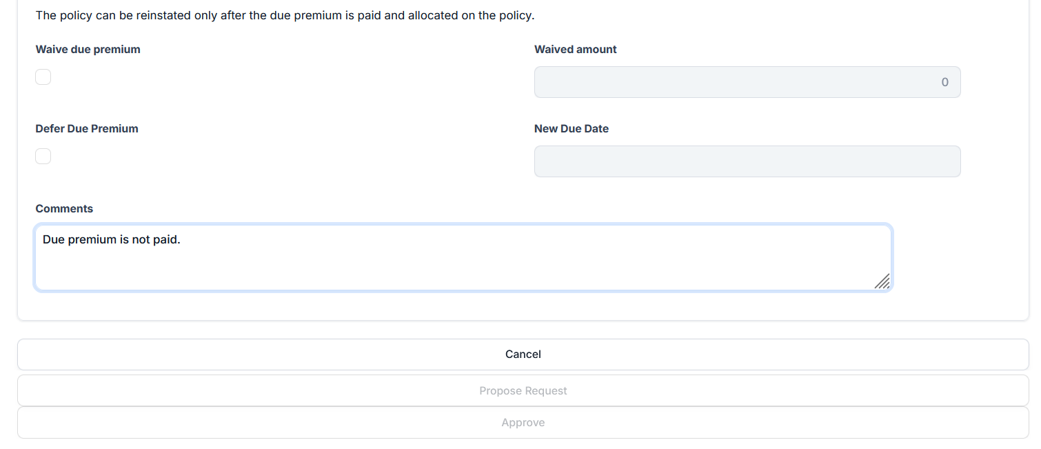 Scroll down to the Due Premium section and tick the box next to Waive due premium . The unpaid sum is automatically displayed in the Waived amount field, which is not editable. The Propose Request button becomes active.