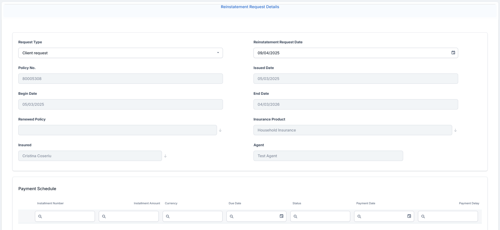 Open the policy and click the Reinstate button at the bottom of the screen. The Reinstatement Request Details form opens.