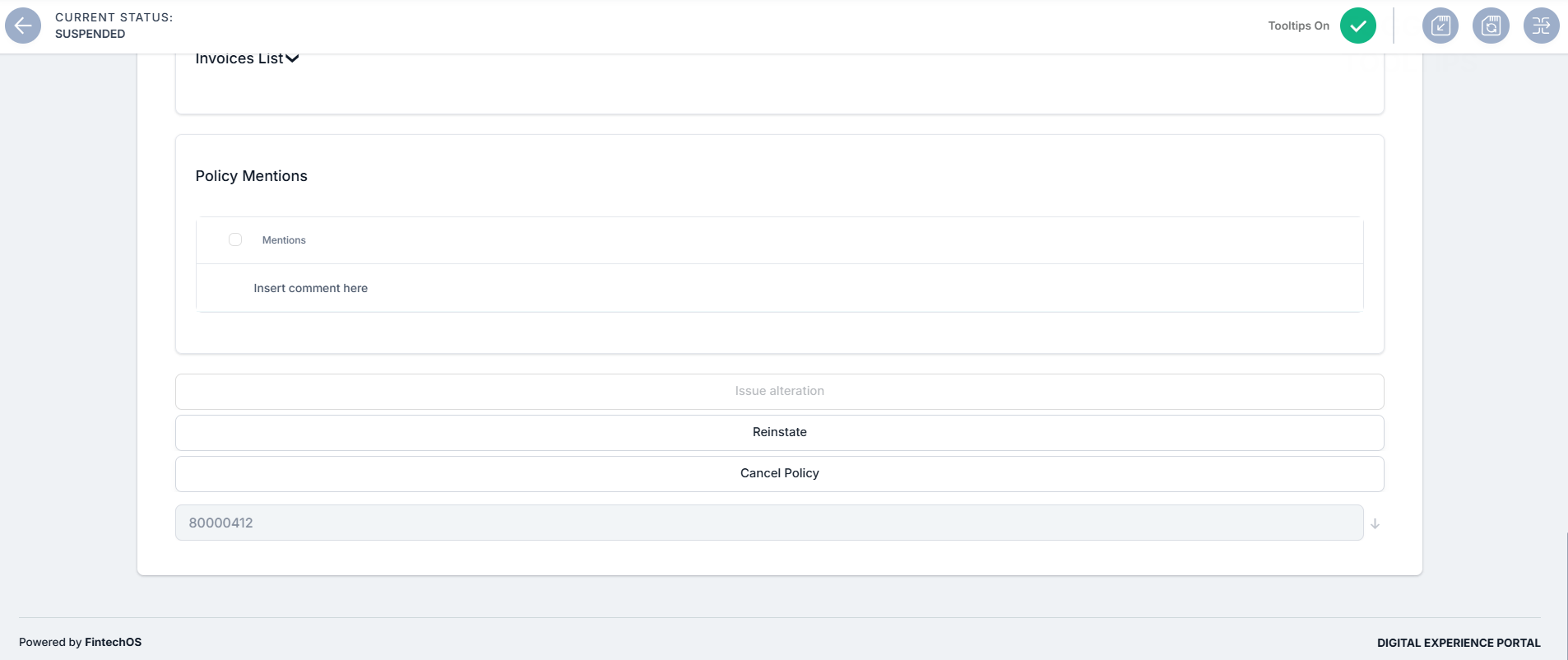 With Policy Administration, the policy reinstatement functionality facilitates a policy transition from Suspended back into InForce, or from Suspended to Canceled/Declined.