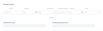 Allocated Invoices: This section displays records of any invoice that is currently allocated to the selected payment. In this section you can also check the status of the Total Allocated Amount and the Remaining Unallocated Amount for the invoices, and you can Remove allocated invoices.