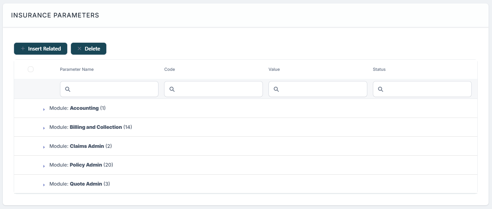 Inside the Settings menu, click on Insurance Parameters. The Insurance Parameters List page is displayed.