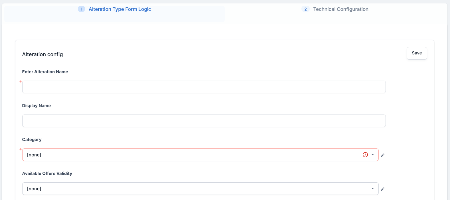 In the Alteration Type Form Logic tab, fill in the following fields in the Alteration Config section: