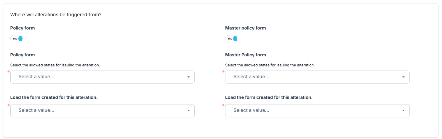 In the next section, Where will alterations be triggered from?, define if you want the alterations to be triggered from the policy form or from the master policy form. In both cases, if the fields are checked, a new section is displayed where you can select in which policy or master policy status the alteration can be issued. Also, select an alteration form driven flow to apply in this case. You can choose an existing flow, or create a new one, and select it.