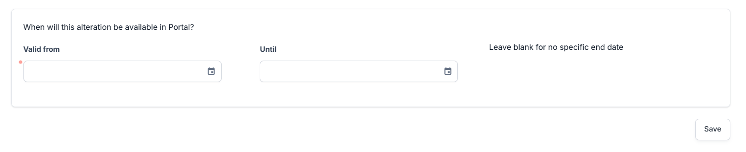 In the last section, When will this alteration be available in Portal?, define the validity time frame of the alteration. Choose a date for the Valid from and for the Until fields. You can leave the last field blank for no specific end date.