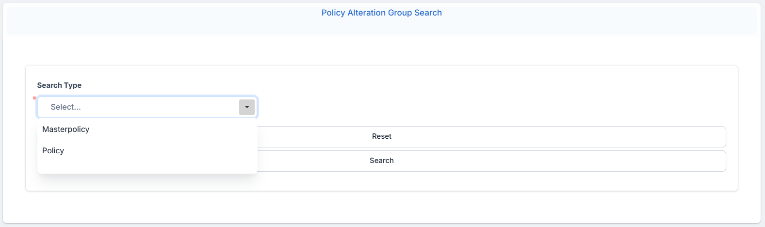 In the Policy Alteration Group Search form, from the Search Type drop down, choose the Policy value.