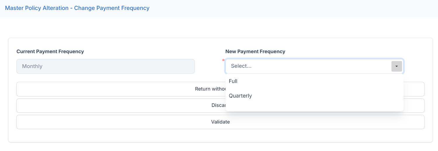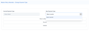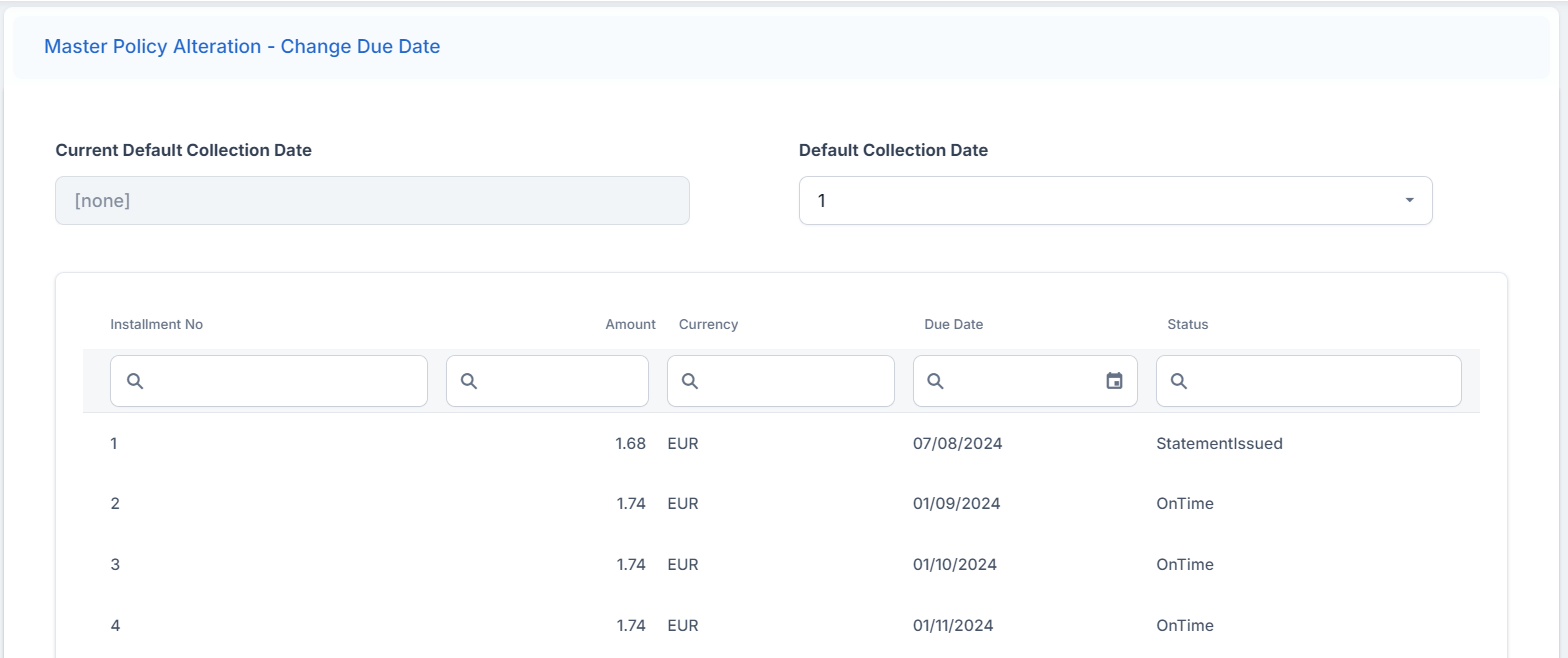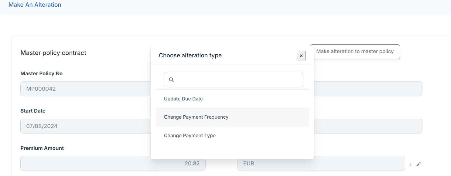 Master policy mid term adjustments (MTAs) comprise of a collection of alterations that apply in the same way for all the policies that are part of said Masterpolicy. These MTA types are: change payment frequency, change payment type, update due date.