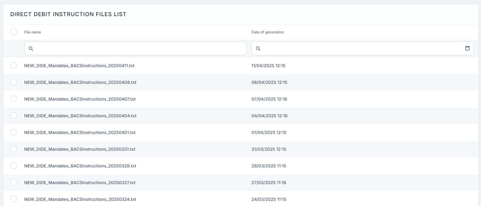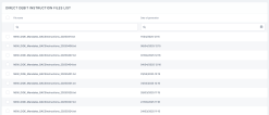 In FintechOS Portal, go to Main Menu > Billing & Collection > DIDE UK > New Mandates Instruction Files. The list of all direct debit instruction files records is displayed.