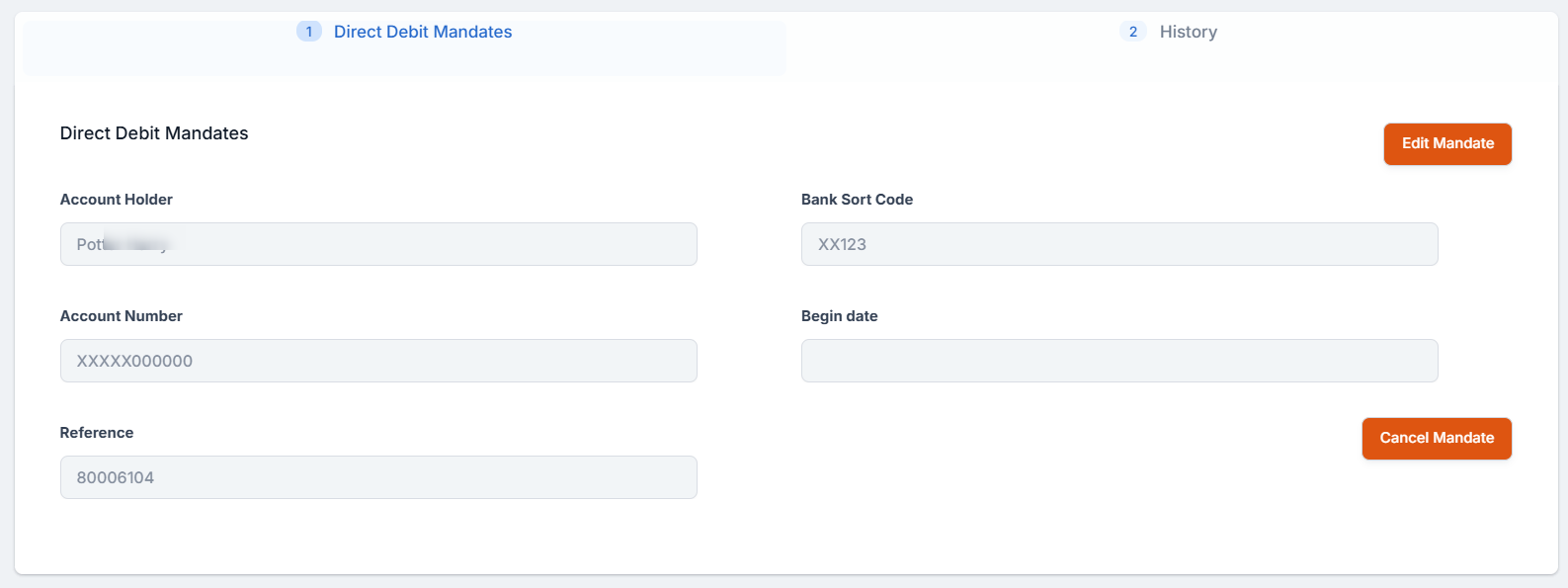 Click Edit Mandate. The following fields become editable: Account Holder, Bank Sort Code, and Account Number.