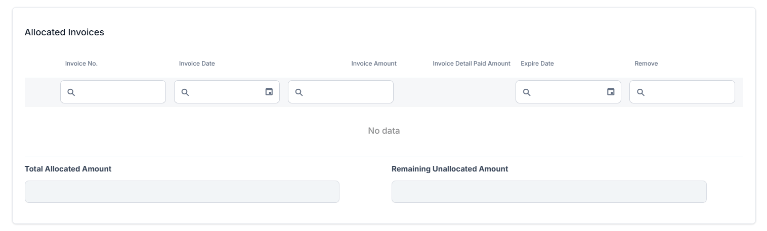 Allocated Invoices: This section displays records of any invoice that is currently allocated to the selected payment. In this section you can also check the status of the Total Allocated Amount and the Remaining Unallocated Amount for the invoices, and you can Remove allocated invoices.