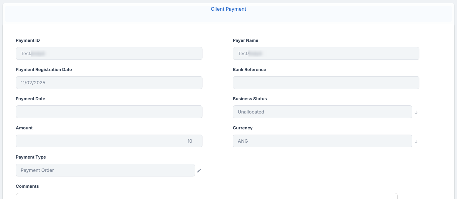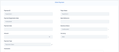 The details of a payment record are not editable. You can only (partially or entirely) allocate, deallocate or return the payment. When the payment is fully allocated, the record changes its business status to Closed.