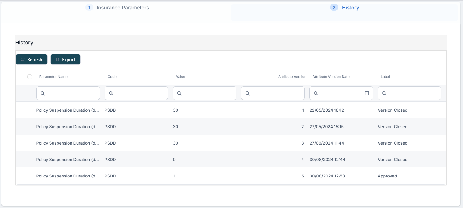 In the main menu, navigate to Settings > Insurance Parameters. The list of existing insurance parameters is displayed.
