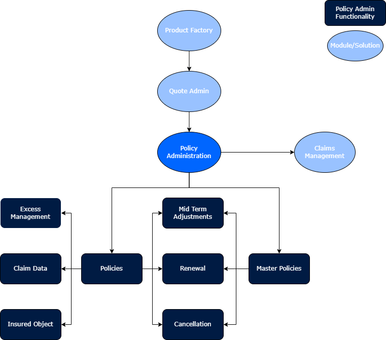 The diagram below presents the Policy Administration module, along with its functionalities, dependencies, and solutions that use the module.