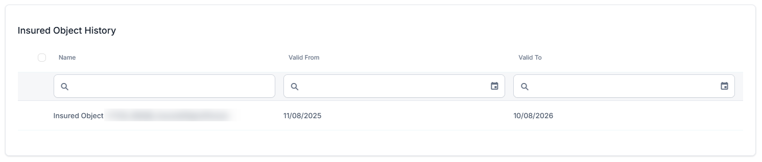 Go to the second tab, Insured Object, which displays the insured objects, together with the valid from and valid to which represent the effective date and policy end date: