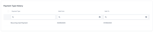 The Payment Type History section holds valid payment types, together with the valid from and valid to which represent the effective date and policy end date: