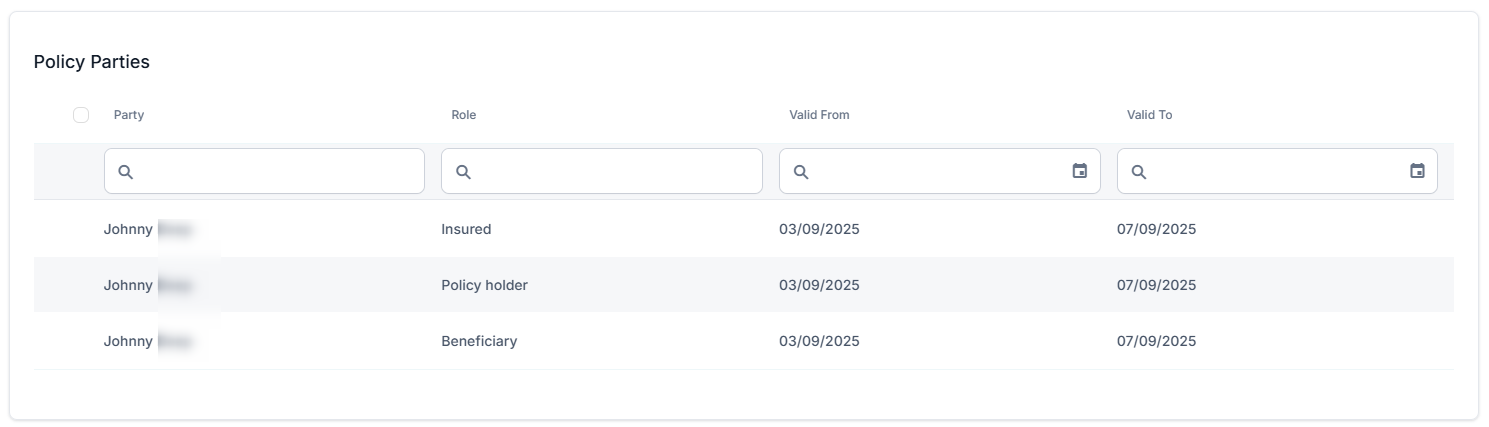 The Policy Parties section, contains valid policy parties and their roles, the valid from and valid to columns which represent the effective date and policy end date: