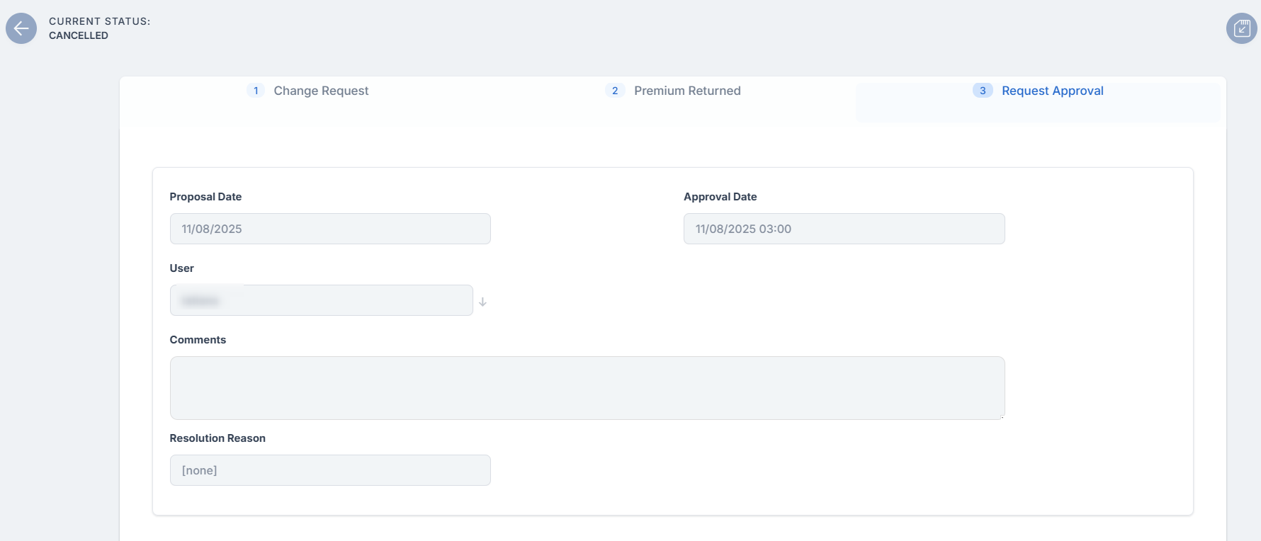 | Proposal Date | The date when the cancellation request was scheduled for approval. It is completed with the current date. |