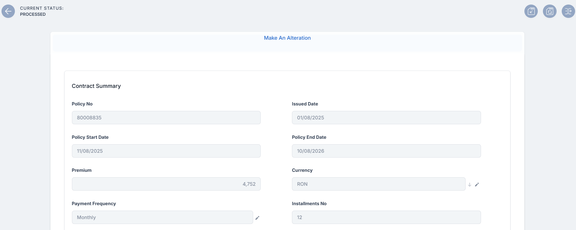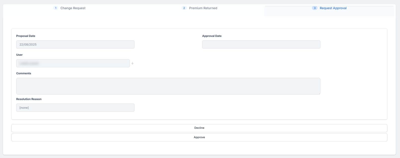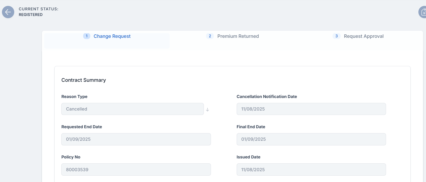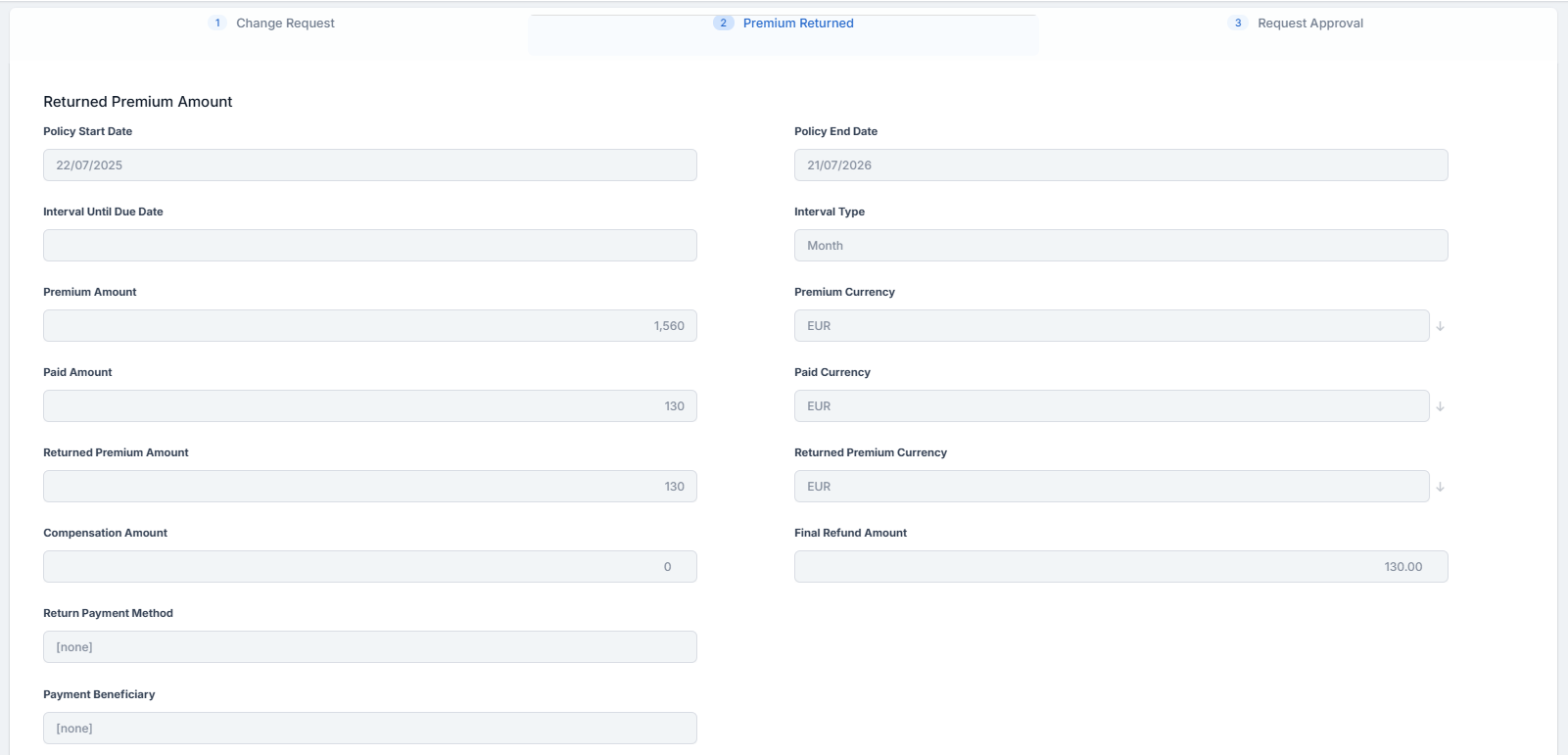 The Premium Returned tab has details regarding the chosen policy, the fields are automatically filled. The pre-filled details are extracted from Policy basic information section and from the results of the calculation made by selecting the information in the Change Request Summary section. The returned premium is the amount refunded to the client when a policy ends early, calculated as the paid premium minus the earned premium, meaning the client gets back the portion of their payment that corresponds to the period they were not covered.