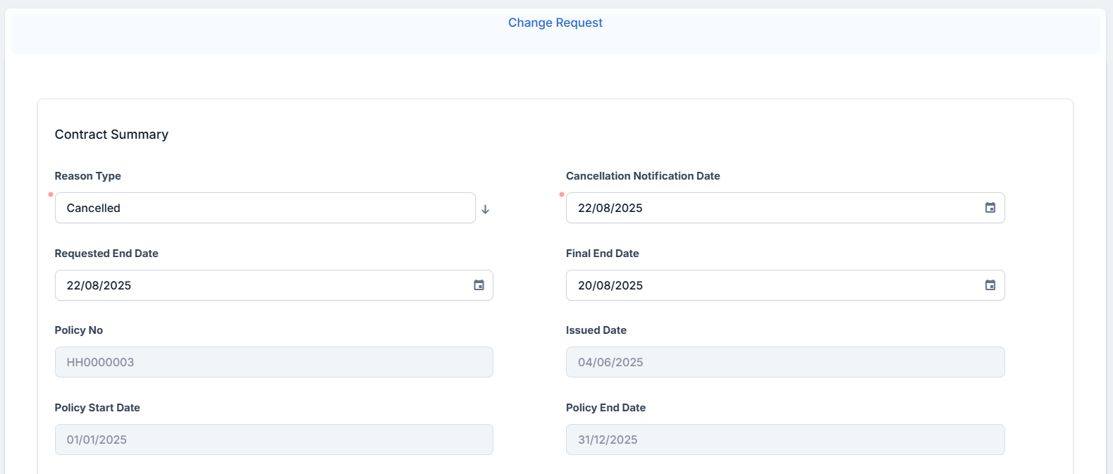 Reason Type Requested End Date Final End Date Cancelled This reason type is the only one that accepts backdating cancellations. In this case, the Requested End Date is overwritten. This is also the case for renewed policies.