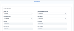 This is where the registration of the request for the policy's cancellation begins. The Edit form of a new Policy Cancellation record opens with Change Request Complete the Change Request Summary fields to trigger the calculations for the payment amounts to be returned to the customer.